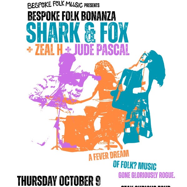 - Bespoke Folk Bonanza feat. Shark & Fox, Zeal H. & CJ Stranger. Imagine you’ve stepped sideways into a fever dream of extra-terrestrial folk — where lush harmonies clash with wild rhythms, folk meets soul and electronica, and you truly belong listening and dancing within this lush, slow burning musical eco-system.