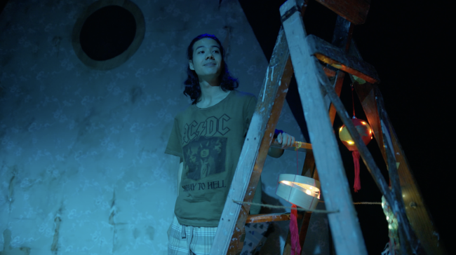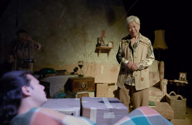 Foo plays a disarming adolescent Heepa who must confront his past actions in order to make the magic work. In a clever device, Lady Dai conjures illuminated symbols of his past that Heepa hangs on the Christmas tree (represented by an old painting ladder), building a physical symbol of his relationship with Paw Paw.