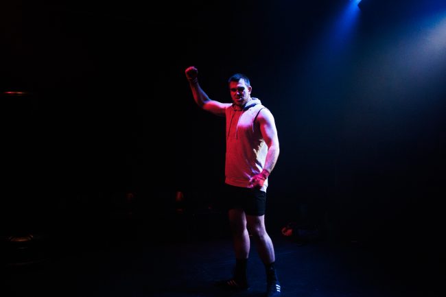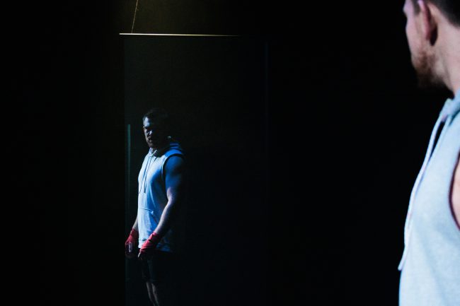 A special mention to Vocal Performance Coach, Donald Woodburn who helped Addison find his voices – the angry violent voice of the boxer and the gentle soft voice of the creator and lover that was desperately trying to manifest itself. And to Addison’s ability to rapidly change from one to the other, often within the same sentence, or sometimes a skilful blend of both simultaneously. The direction of Teresa Izzard who doubled as Motion Coach enhanced the duality of Flynn’s character whose fantasy lover – if not his desire for himself – was not for a rugged burly boxer but conversely the finesse and litheness of a dancer. The juxtaposition of violent sparring and graceful ballet steps was entirely credible in the hands of the talented creative team. The lighting design (Christian Lovelady) was simple but effective, and could be reduced to red for blood and violence or blue for longing and love. And I liked the use of shadows to cleverly illuminate the title of the work.