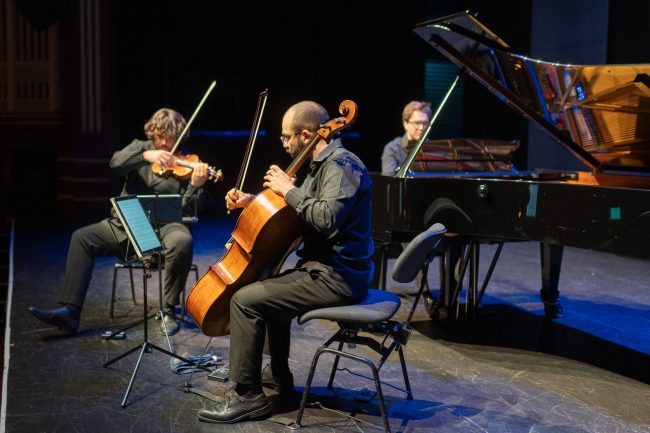 The program opens with Brahms’ Piano Trio in C minor Op.101, a stalwart of the repertoire. Composed when Brahms was 53, it is a mature work but does not display his later-in-life tendency for (dare I say) long-windedness, this one coming in at only 22 minutes. By the 2nd movement, presto non assai, the trio had found their voice, and sat comfortably in the acoustic of the space and the tone of the grand piano. It must be a challenge for the pianist playing on a different instrument every night, but Erdem Mısırlıoğlu was obviously accustomed to the task. The sonorities were well matched between the lower piano notes and the cello, between the two string instruments, and between the upper registers of all three: again sounding like one unified entity. The trio’s technique was shown to perfection in the final movement with the difficult cross and counter rhythms never missing a beat, and the building of excitement concluding with a precise and rewarding cadence.